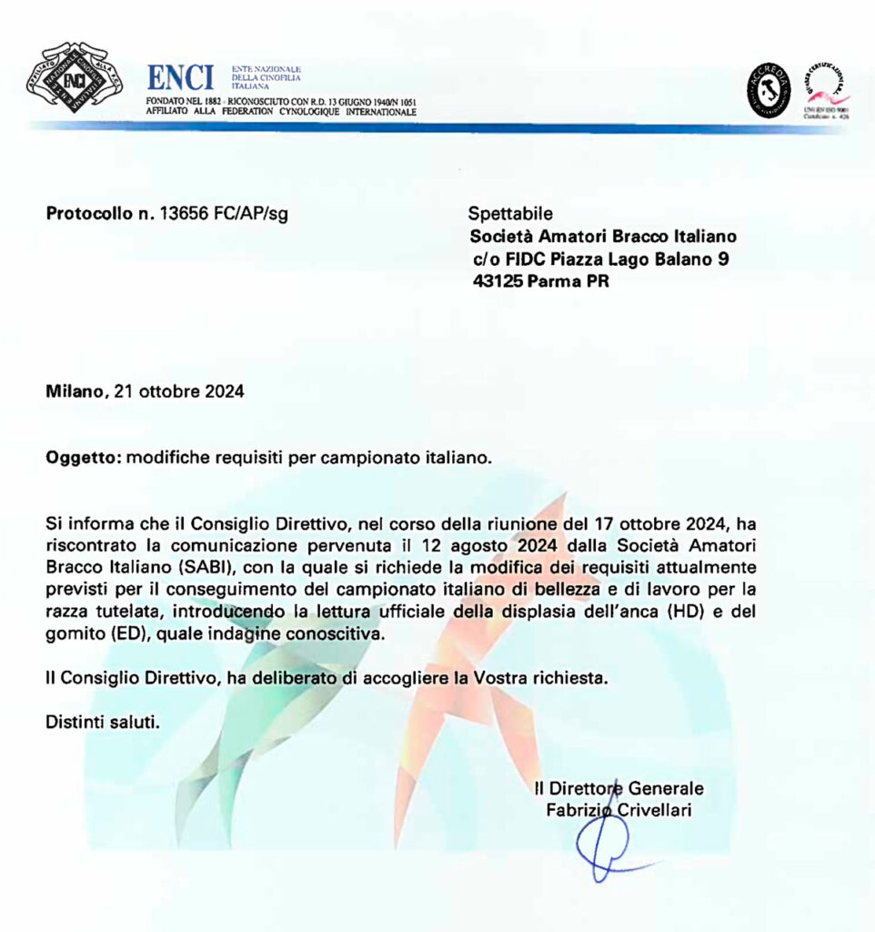 La Società Amatori Bracco Italiano è lieta di comunicare che la richiesta presentata lo scorso 12 agosto 2024 è stata accolta dal Consiglio Direttivo dell’Ente Nazionale della Cinofilia Italiana (ENCI) durante la riunione del 17 ottobre 2024.